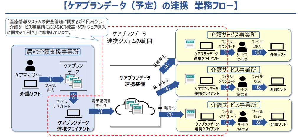 ケアプランデータ連携システムとは、居宅介護支援事業所と介護サービス事業所間で、毎月やりとりされる居宅サービス計画書、サービス利用票(予定・実績)等のケアプランをクラウド上で安全にデータ連携するためのシステム基盤のことです。 本格稼働が開始したのは令和5年4月です。