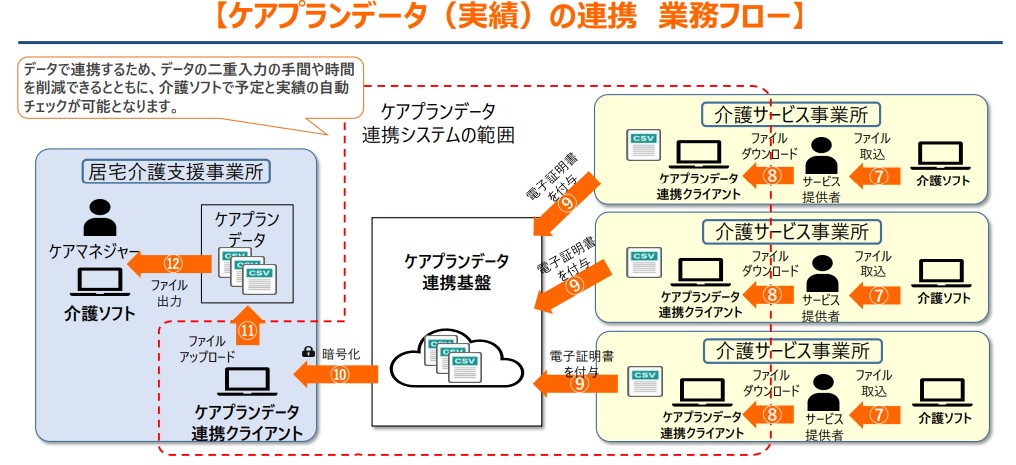 これまでのように、手書きや印刷したケアプランのデータをFAXなどでやりとりする手間を省き、データでやり取りをすることで安全にそして円滑にデータ連携をすることができるようになります。