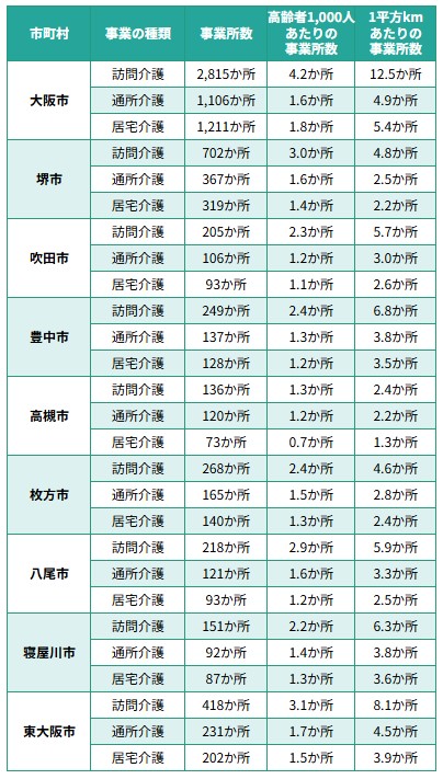 さらに、大阪府内では高齢者1,000人あたりの事業所数に地域差があり、大阪市では訪問介護が4.2か所に達する一方で、堺市は3.0か所、吹田市は2.3か所とバラつきがあります。これらのデータは、地域ごとの競争環境や需要を分析し、戦略的に開業エリアを選定する際に重要な指標となります。