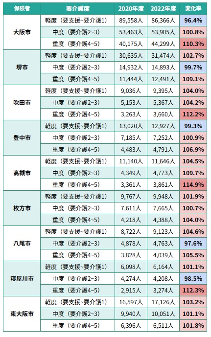 例えば、大阪市では重度介護の認定者数が110.3%に増えており、他の都市でも吹田市(112.2%)、高槻市(114.9%)と同様の増加傾向が見られます。高齢化が進むことで、重度の介護を必要とする高齢者向けの施設やサービスの需要が今後さらに拡大することも予想されます。