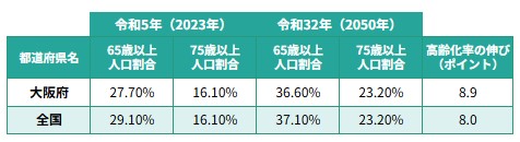 令和6年版高齢社会白書によると、2023年時点で、大阪府の65歳以上人口割合は27.7%で、2050年には36.6%に達すると予測されています。この伸び率は全国平均(8.0ポイント)を上回る8.9ポイントとなっており、大阪府は急速な高齢化を迎えることがわかります。