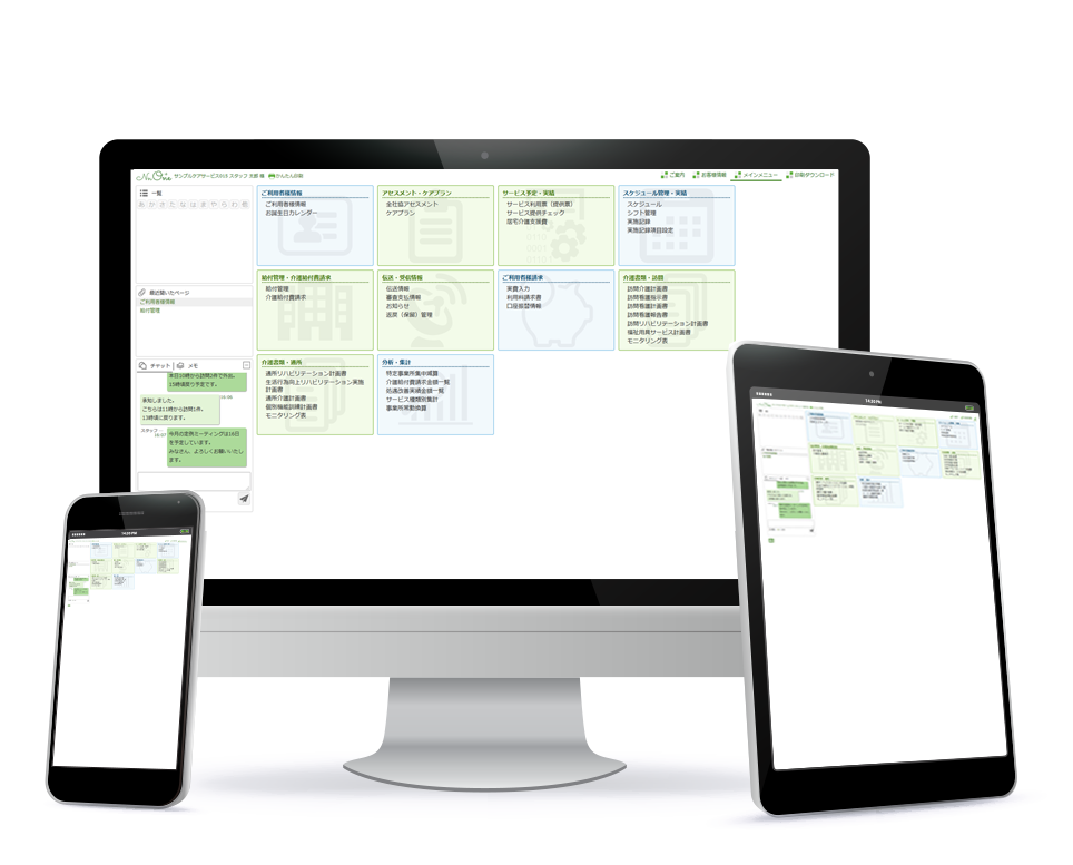 クラウド型介護ソフトなので、インストールなどの面倒な初期設定もなく、簡単に使い始めることができます。スマホやタブレットでの操作も可能です。