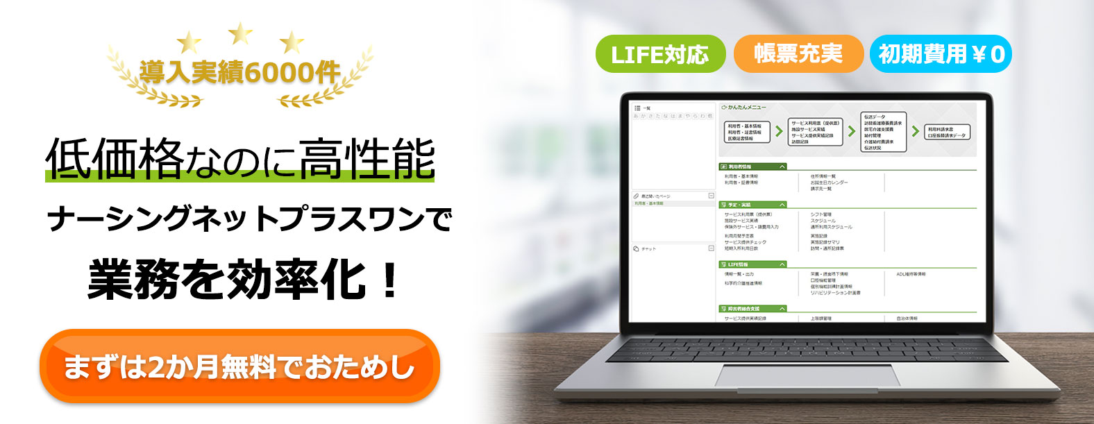 ナーシングネットプラスワンはログイン型の介護ソフトなので面倒な初期設定やバックアップは不要です。メンテナンスがいらないのでパソコンが苦手な方でも気軽に導入する事ができます。万が一困った時には介護事務管理士の資格を持ったオペレーターがサポートいたしますのでお気軽にお電話ください。