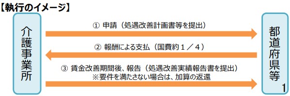 加算申請の方法は、各事業所が都道府県等に職員の月額賃金の改善額を記した計画書を提出します。月額賃金の改善額とは、職員個人のものではなく職員全体の総額での改善額です。提出用の書類は各都道府県のホームページに掲載されていますのでご確認ください。