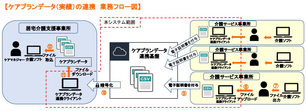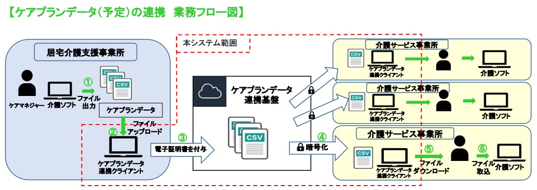 ケアプランデータ連携システムとは、居宅介護支援事業所と介護サービス事業所間で、毎月やりとりされる居宅サービス計画書、サービス利用票(予定・実績)等のケアプランをクラウド上で安全にデータ連携するためのシステム基盤のことです。 本格稼働が開始したのは令和5年4月です。