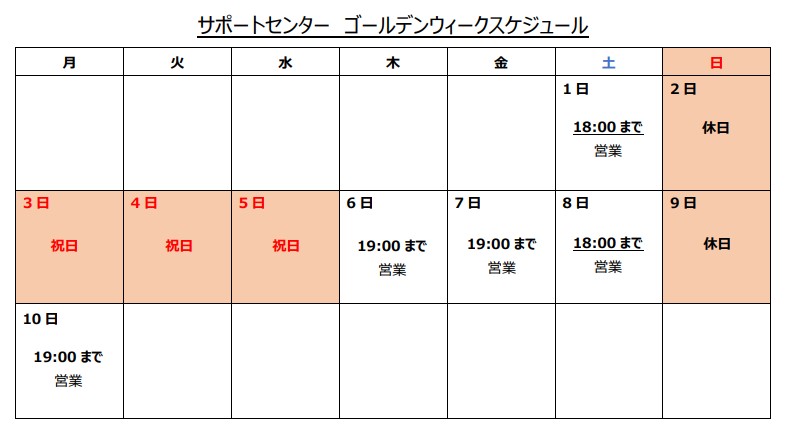 2021年ゴールデンウィークの営業について 弊社サポートセンターのゴールデンウィークのスケジュールは、下記のとおりとさせていただきます。土曜日の 5 月 1 日、5 月 8 日は 9 時から18 時まで営業いたしますのでぜひご利用ください。