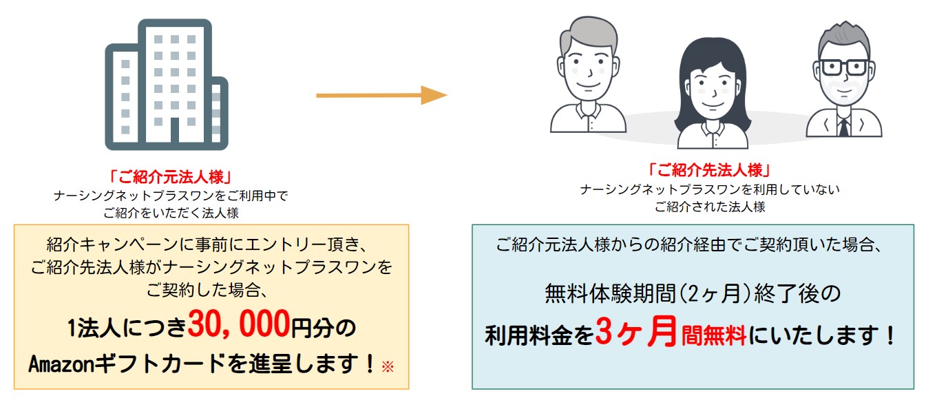 1法人ご紹介につき、ご紹介法人様へAmazonギフトカードを3万円分プレゼント、紹介された事業所様も無料体験2か月終了後、さらに3か月無料でソフトをご利用いただけるお得なキャンペーンとなっております。