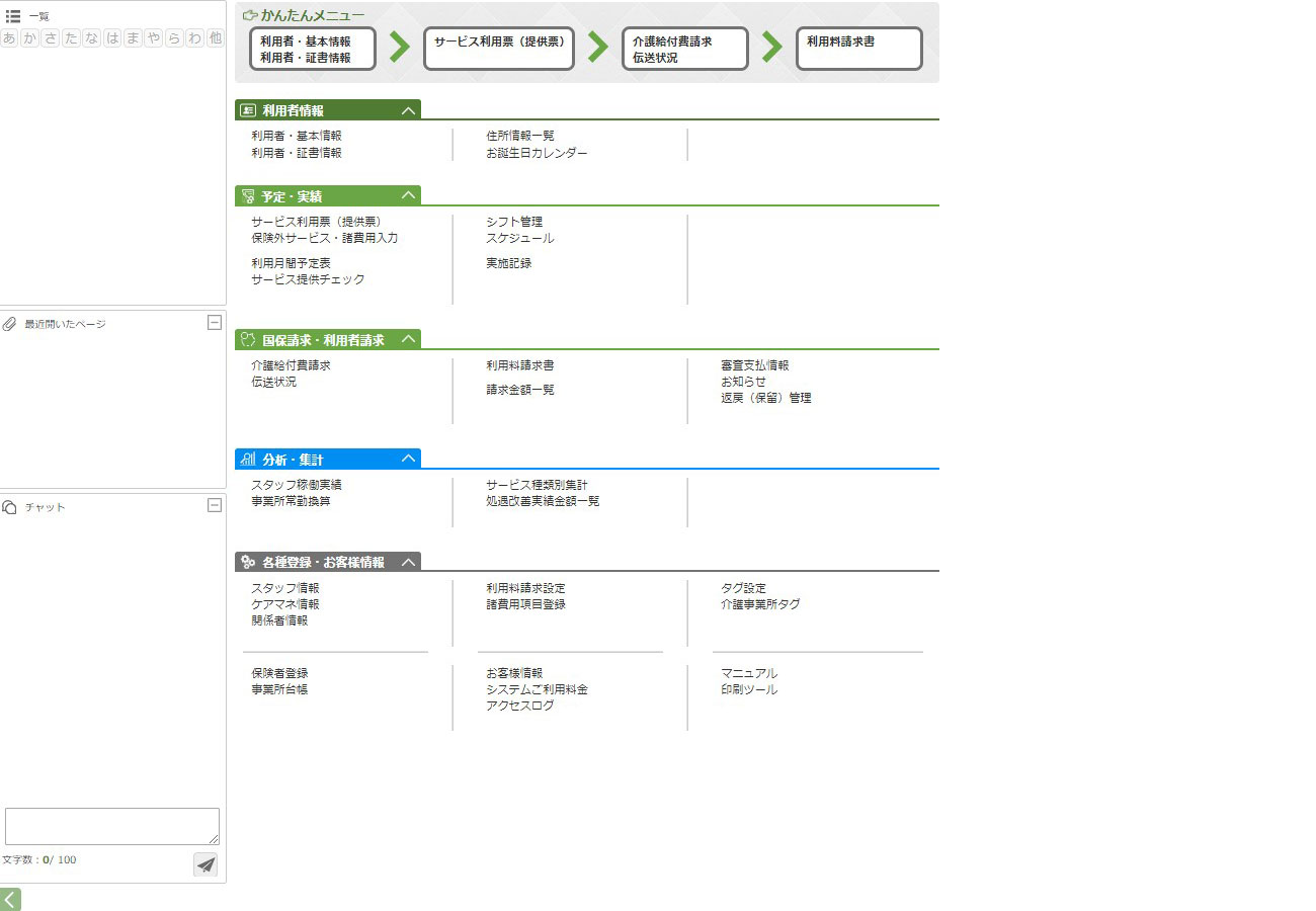 ご利用者様情報の登録から、サービス利用票(提供票)の作成、給付管理・介護給付費請求書作成などが行えます。